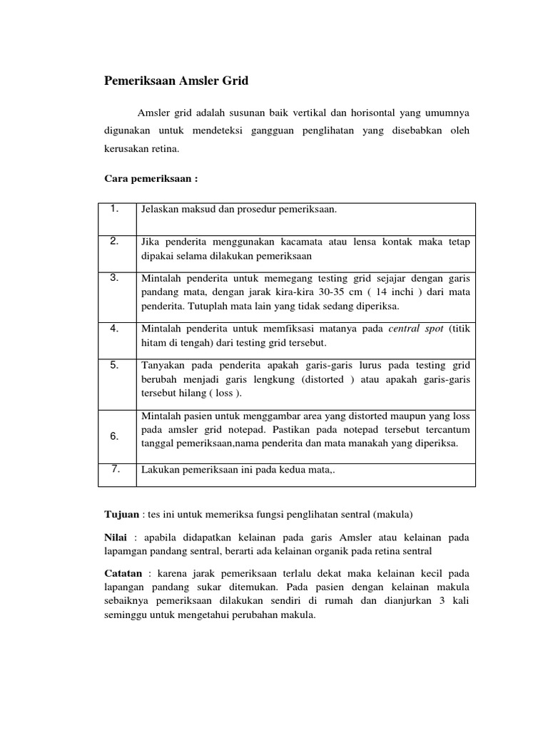 Tes Amsler Grid Amsler grid adalah susunan baik vertikal dan horisontal yang umumnya digunakan untuk mendeteksi gangguan penglihatan yang disebabkan oleh kerusakan retina. Fight reading glasses if you use reading glasses. Melakukan pemeriksaan dan penilaian segmen posterior dengan benar menggunakan funduskopi dan pemeriksaan amsler grid.